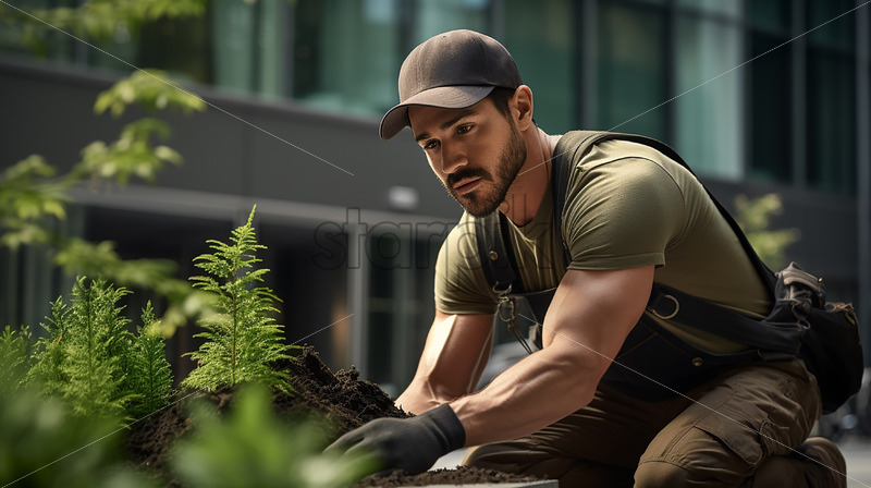 Landscapers man doing his job planting plants and landscaping wearing his landscapers attire, cap and gloves