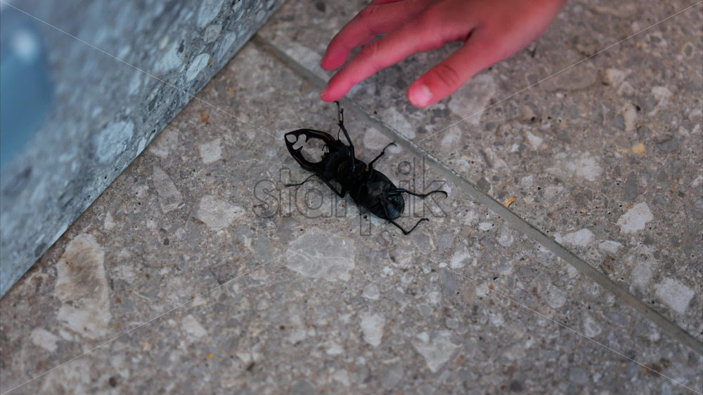 Large stag beetle crawling on pavement near child’s hand Royalty Free Stock Video Footage