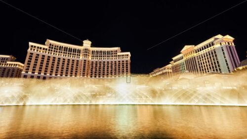 LAS VEGAS, USA – SEPTEMBER 24, 2019: Bellagio fountain at night with hotels on the background