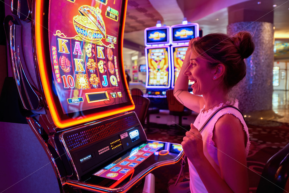 LAS VEGAS, USA – SEPTEMBER 24, 2019: Happy woman playing on a slot machine inside the casino