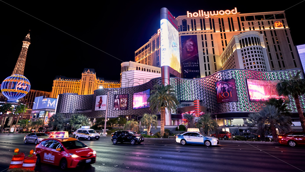 LAS VEGAS, USA – SEPTEMBER 24, 2019: Planet Hollywood hotel at night with palms and road on the foreground