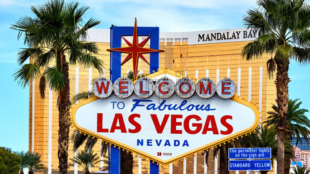 LAS VEGAS, USA – SEPTEMBER 25, 2019: Welcome to Fabulous sign with Mandalay Bay Hotel on the background