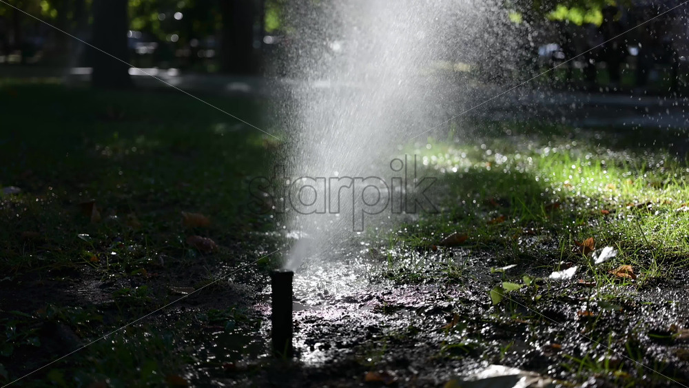 A garden sprinkler sprays water into the air, with sunlight reflecting off the droplets in a green park Royalty Free Stock Video Footage