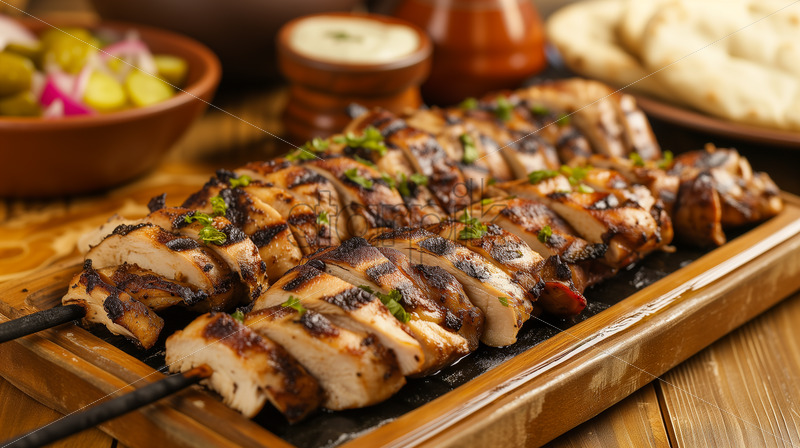 A tantalizing photograph showcasing Lebanese Chicken Shawarma, marinated and grilled slices of chicken served with tahini sauce.