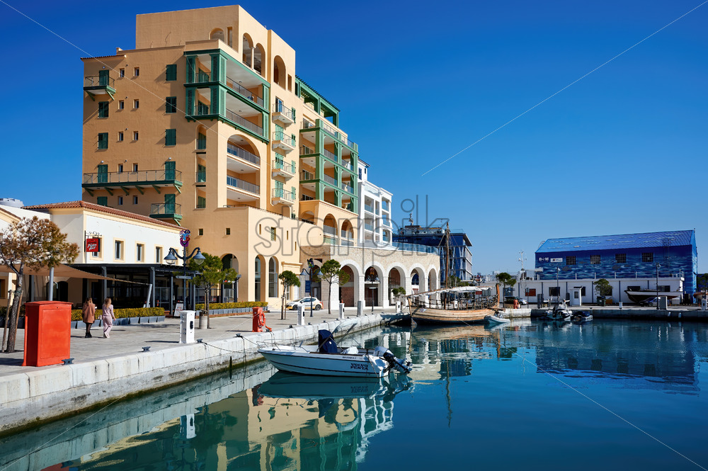 LIMASSOL, CYPRUS – FEBRUARY 17, 2020: Embankment street with parked boats, residential buildings and two walking women