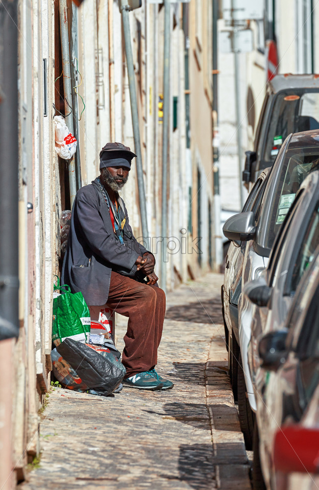 Home » Shop » photo » LISBON, PORTUGAL – NOVEMBER 4, 2019: Vertical shot of a black homeless man in a sunny day