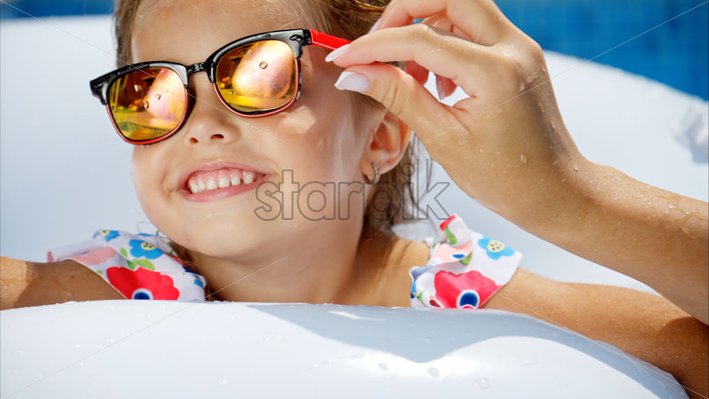 Little girl with red sunglasses resting at the pool Royalty Free Stock Video Footage