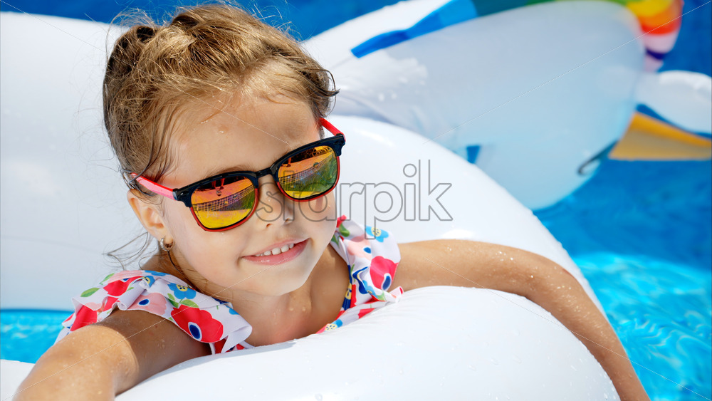 Mother with father and daughter resting and swimming in a pool in summer, happy family kissing