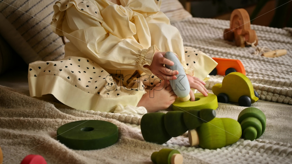 Home » Shop » 1 Video » Video – Little girl playing with a wooden poplar tree toy among others ecological toys. Sustainability concept