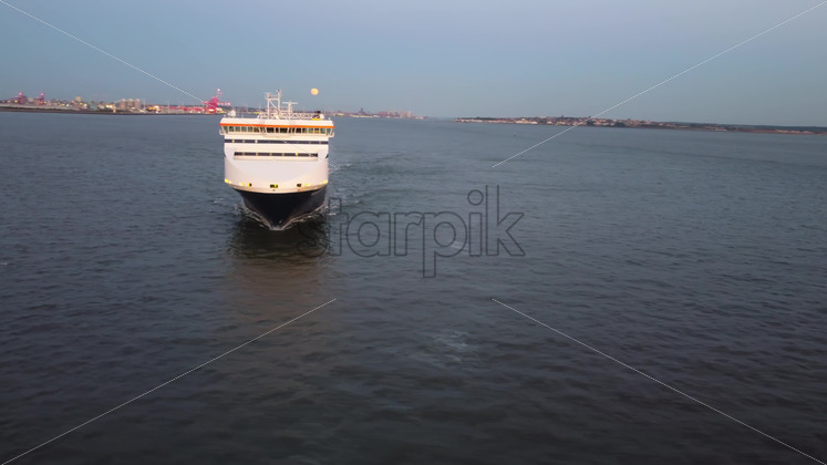 LIVERPOOL, UNITED KINGDOM – MAY 10 2023: Aerial drone vew of Seatruck cargo boat near port at sunset Royalty Free Stock Video Footage