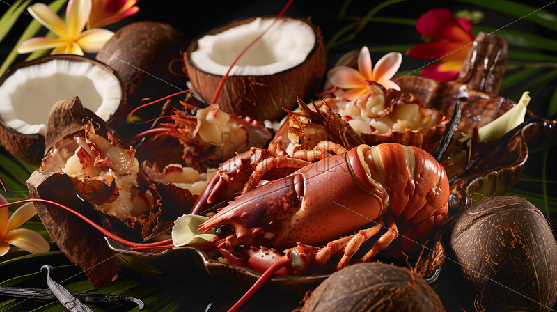 Comorian Langouste à la Vanille, lobster cooked with vanilla, coconut milk, and spices.
