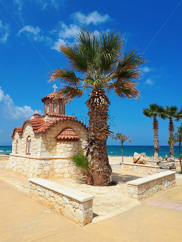 Local church and palm trees near sea and beach with blue sky in heraklion, crete island, greece Royalty Free Stock photo