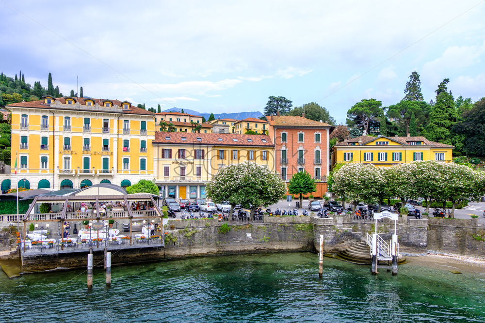 LOMBARDY, ITALY – AUGUST 03, 2018: Bellagio city shore with people and parked cars. View from Lake Como Royalty Free Stock photo