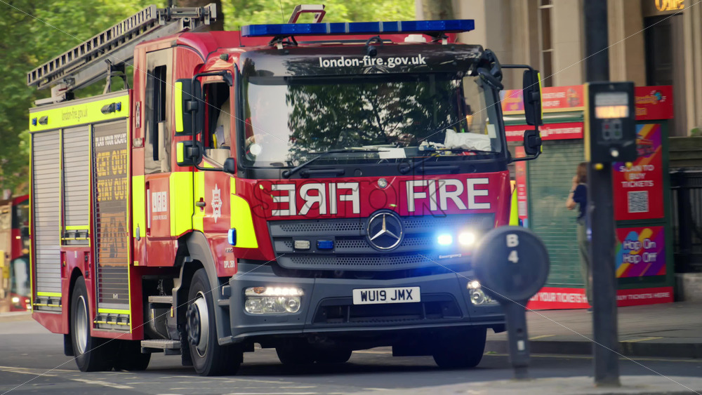 London, England – May 11, 2025: Fire truck driving with lights on through Charing Cross street Royalty Free Stock Video Footage
