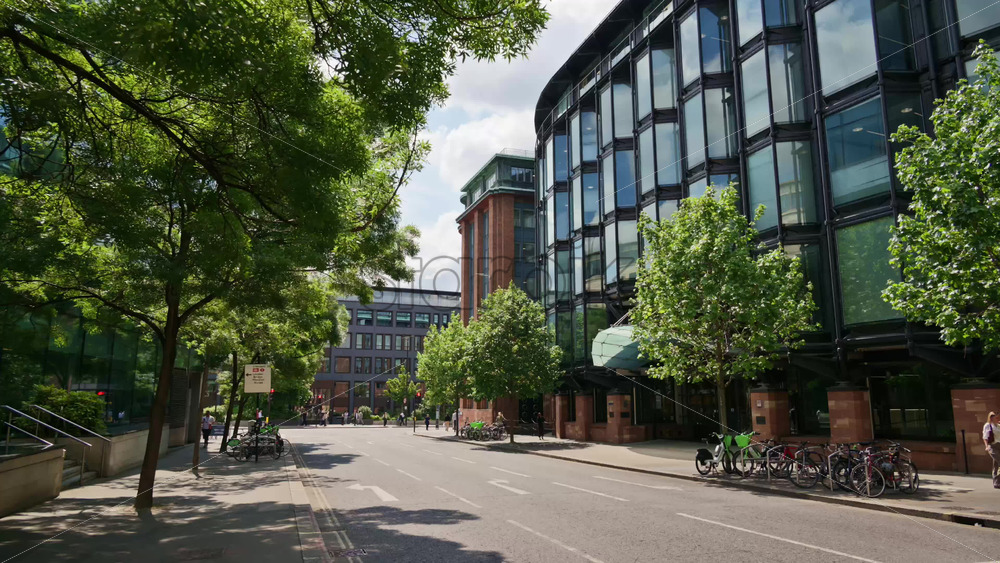 London, England – May 12, 2025: Modern business district in the city center with tree-lined street, bicycles, and glass buildings in daylight Royalty Free Stock Video Footage