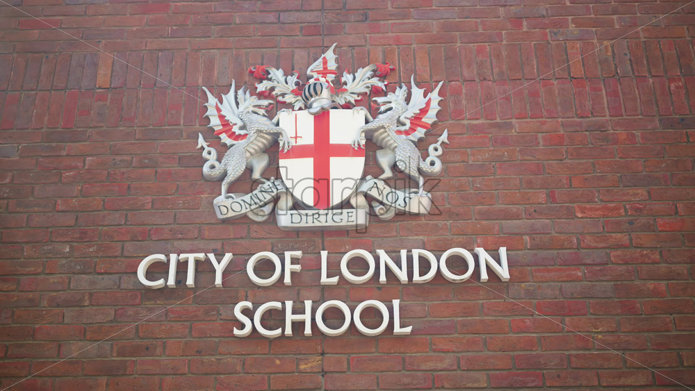 London, England – May 13, 2025: Close-up of the City of London School crest mounted on a red-brick wall in daylight Royalty Free Stock Video Footage