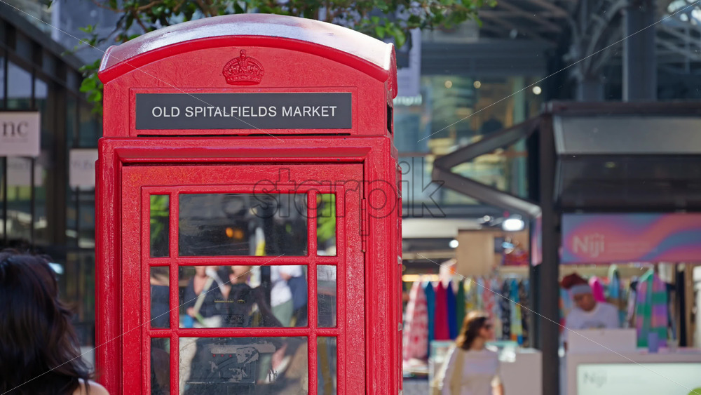 London, England – May 13, 2025: Iconic red British phone booth repurposed with an Old Spitalfields Market sign, set against modern market surroundings Royalty Free Stock Video Footage