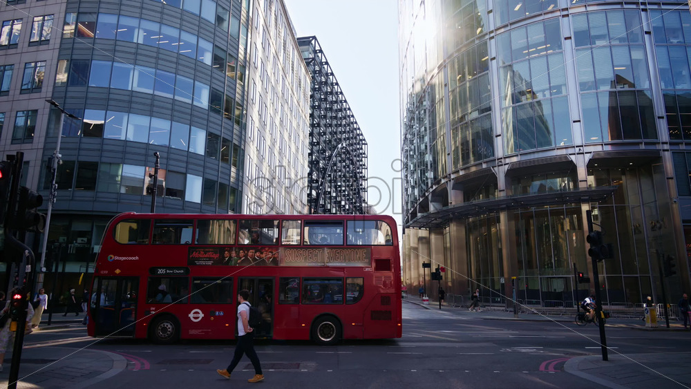 London, England – May 13, 2025: Red double-decker bus near Primrose street with reflective glass buildings around Royalty Free Stock Video Footage
