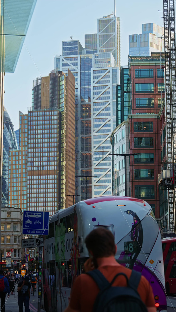 London, England – May 13, 2025: Modern glass skyscrapers of London’s financial district reflecting the blue sky next to historic architecture. Vertical Royalty Free Stock Video Footage