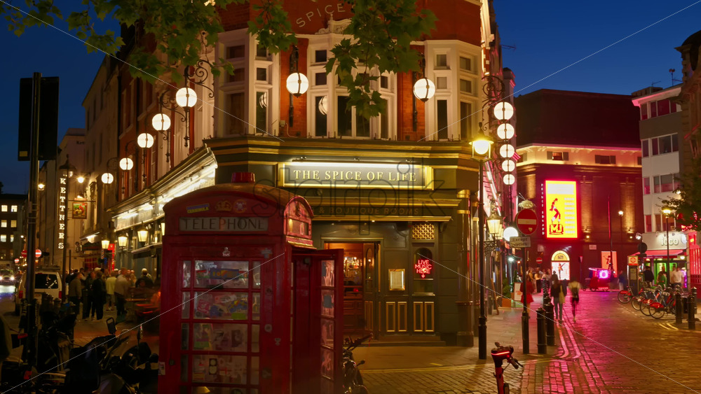 London, England – May 14, 2025: Time lapse of a warmly lit view of people moving near The Spice of Life pub next to a red phone booth in the evening. Soho Royalty Free Stock Video Footage