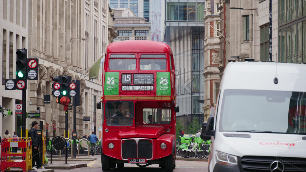 London, England – May 13, 2025: Red double-decker bus passing through the financial district of the city near Liverpool station Royalty Free Stock Video Footage