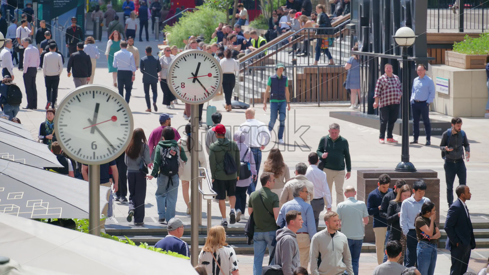 London, England – May 16, 2025: Busy pedestrian street filled with people walking, flanked by modern clocks on poles. Canary Wharf Royalty Free Stock Video Footage