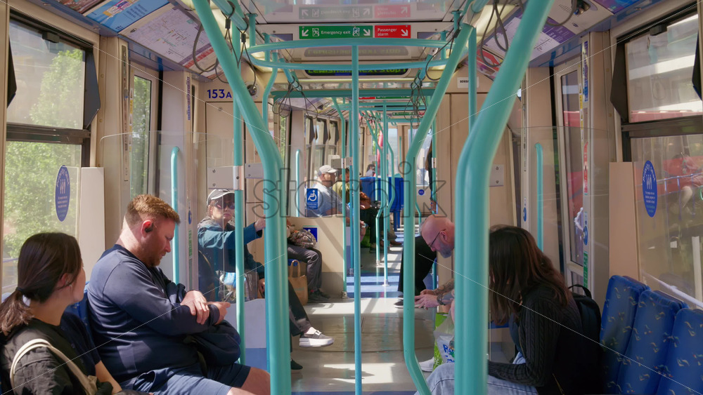 London, England – May 16, 2025: Interior view of a light rail tram or train car during the day with passengers seated on both sides Royalty Free Stock Video Footage