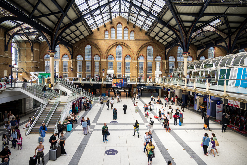 Home » Shop » photo » LONDON, UNITED KINGDOM – AUGUST 23, 2023: Interior view of the Liverpool Street Station in city downtown with multiple people and shops inside
