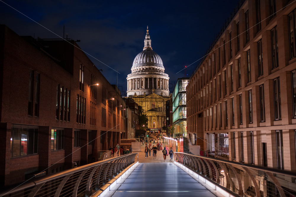 LONDON, UNITED KINGDOM – AUGUST 23, 2023: Saint Paul’s Cathedral at night with street view on the foreground, buildings, walking people and illumination