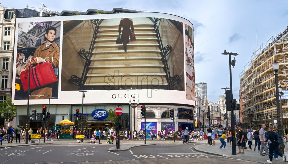 LONDON, UNITED KINGDOM – SEPTEMBER 11, 2023: Street scape of the city. Piccadilly Circus with multiple people, classic buildings with advertising screens