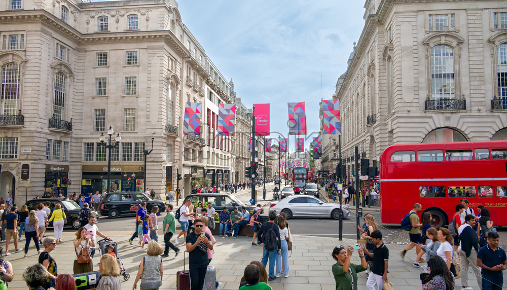 LONDON, UNITED KINGDOM – SEPTEMBER 11, 2023: Street scape of the city. Piccadilly Circus with multiple walking people and moving cars, classic buildings