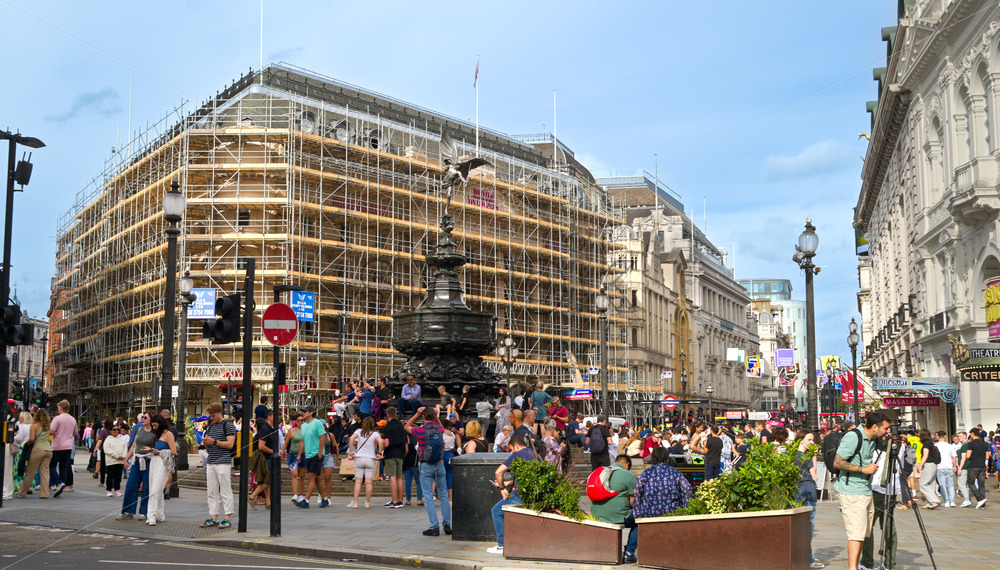 LONDON, UNITED KINGDOM – SEPTEMBER 11, 2023: Street scape of the city. Piccadilly Circus with people near the Shaftesbury Memorial Fountain and classic buildings