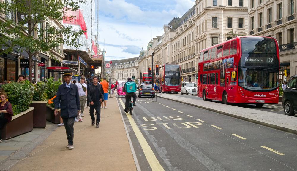 LONDON, UNITED KINGDOM – SEPTEMBER 11, 2023: Street scape of the city. Regent street with multiple walking people, greenery, classic buildings and red busses