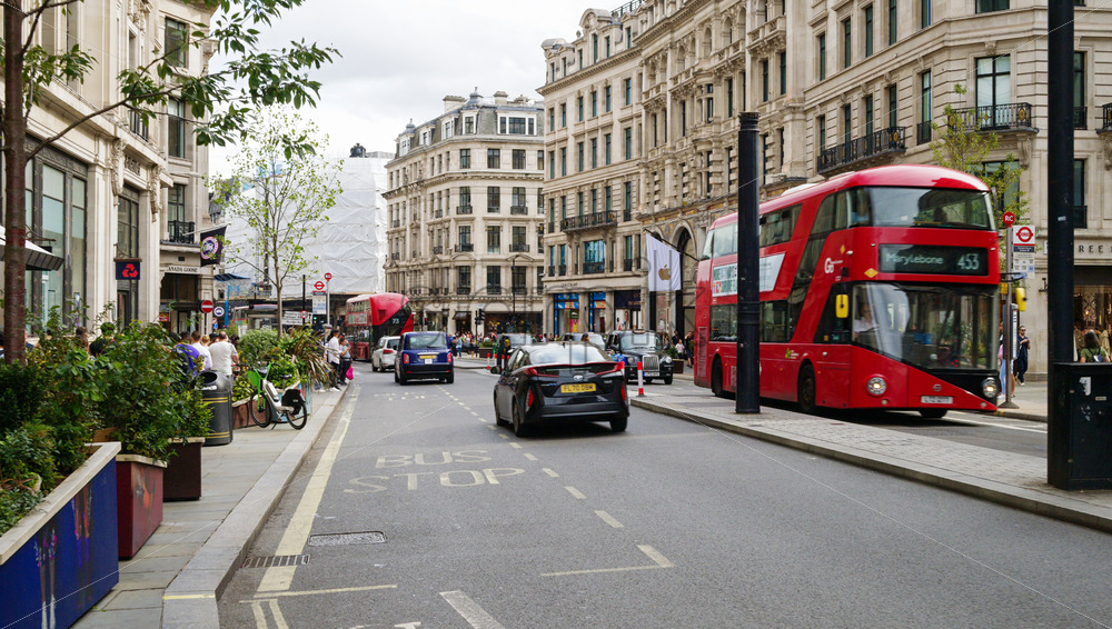 Home » Shop » photo » LONDON, UNITED KINGDOM – SEPTEMBER 11, 2023: Street scape of the city. Regent street with multiple walking people, greenery, classic buildings and red busses