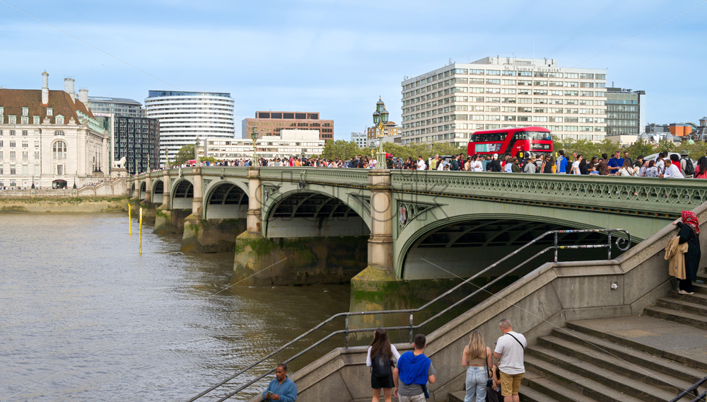 Home » Shop » photo » LONDON, UNITED KINGDOM – SEPTEMBER 11, 2023: Street scape of the city. Westminster bridge over the Thames with multiple walking people and moving cars, modern buildings on the background