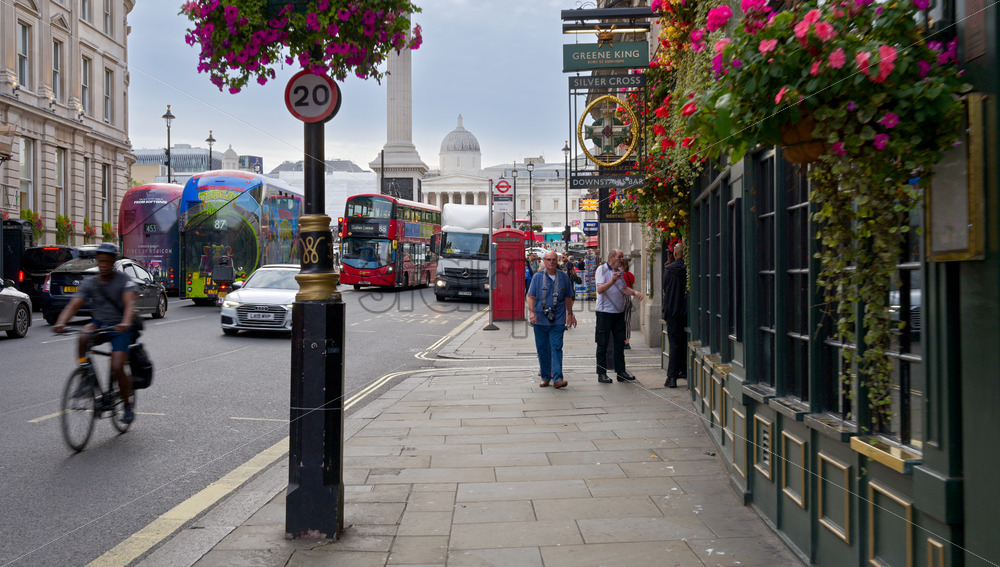 LONDON, UNITED KINGDOM – SEPTEMBER 11, 2023: Street scape of the city. Whitehall Street with walking people, classic buildings and moving cars, Nelson’s Column and Trafalgar square in the distance