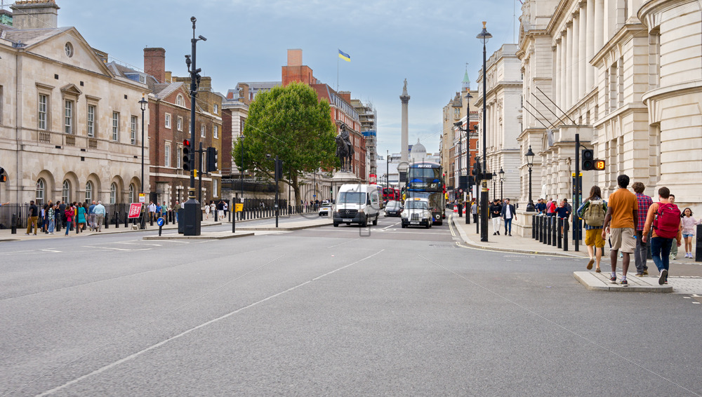 Home » Shop » photo » LONDON, UNITED KINGDOM – SEPTEMBER 11, 2023: Street scape of the city. Whitehall Street with walking people, classic buildings and moving cars, Nelson’s Column and Trafalgar square in the distance