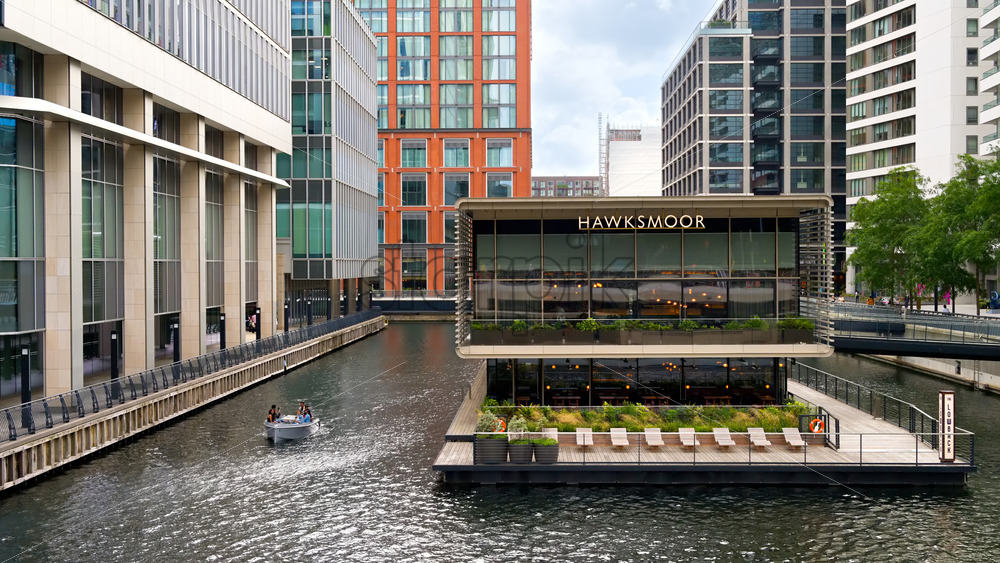 Home » Shop » photo » LONDON, UNITED KINGDOM – SEPTEMBER 12, 2023: Street scape of the Canary Wharf district, water channels with people floating on a boat and restaurant, greenery and skyscrapers