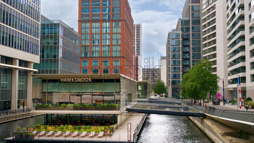 Home » Shop » photo » LONDON, UNITED KINGDOM – SEPTEMBER 12, 2023: Street scape of the Canary Wharf district, water channels with restaurant, greenery and skyscrapers