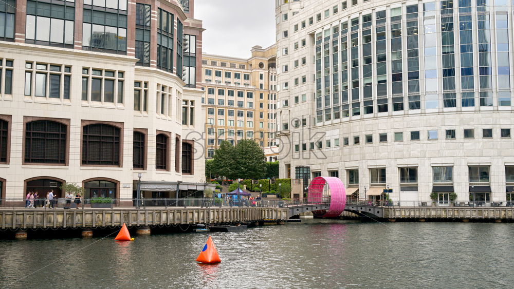 LONDON, UNITED KINGDOM – SEPTEMBER 12, 2023: Street scape of the Canary Wharf district, water channels with walking people, modern buildings and skyscrapers around
