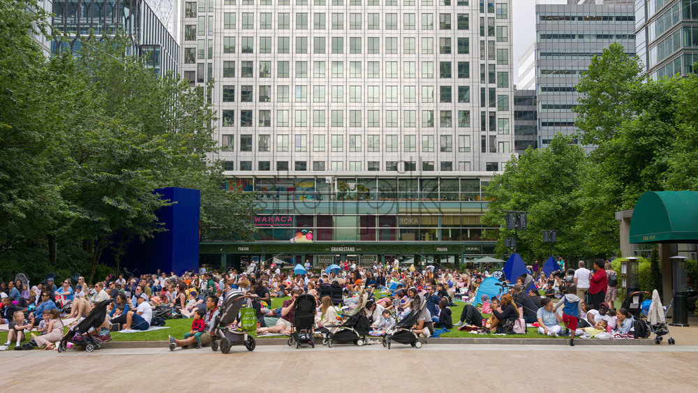 LONDON, UNITED KINGDOM – SEPTEMBER 12, 2023: Street scape of the Canary Wharf district with a square full of people and greenery, One Canada Square skyscraper on the background
