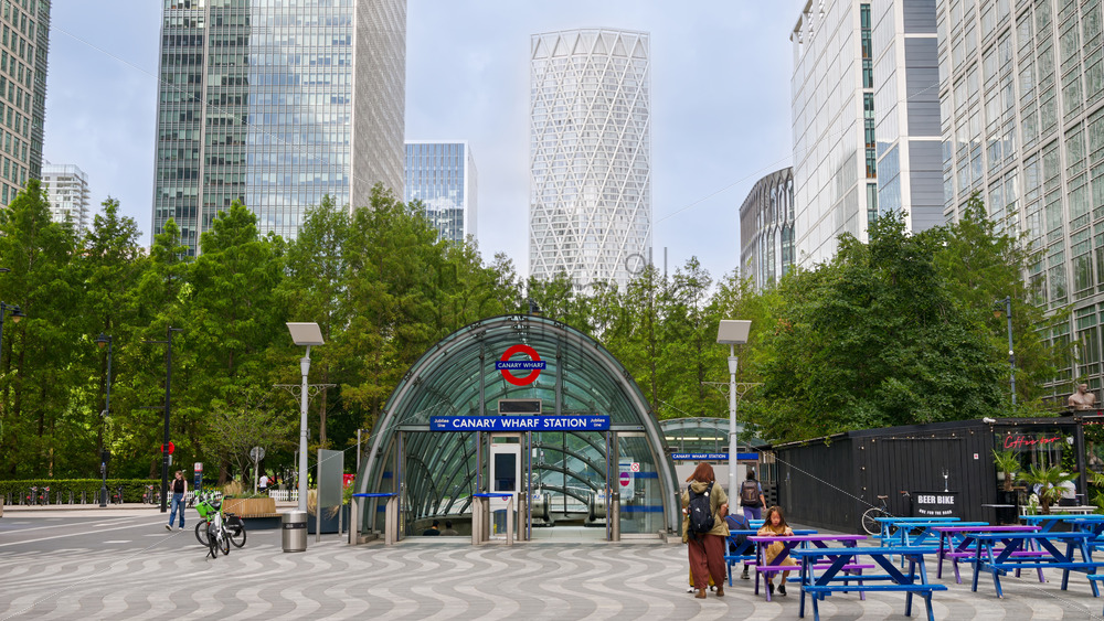LONDON, UNITED KINGDOM – SEPTEMBER 12, 2023: Street scape of the Canary Wharf district with Underground station, greenery and skyscrapers