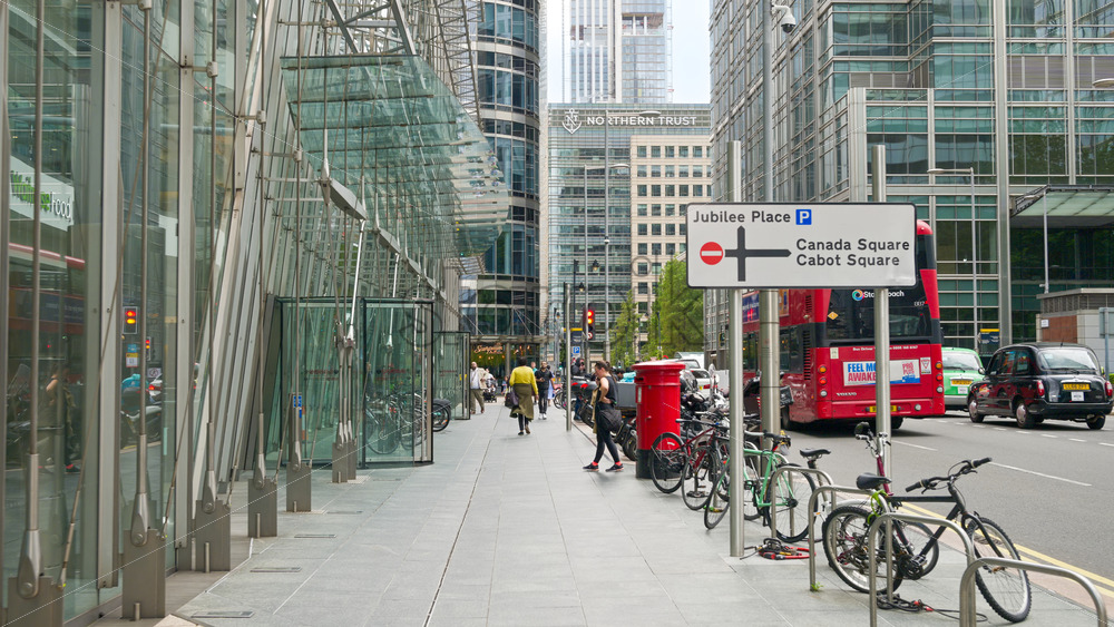 Home » Shop » photo » LONDON, UNITED KINGDOM – SEPTEMBER 12, 2023: Street scape of the Canary Wharf district with walking people, cars and skyscrapers around