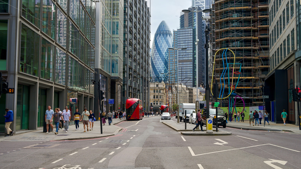 LONDON, UNITED KINGDOM – SEPTEMBER 12, 2023: Street scape of the City district with walking people, moving cars, modern buildings and skyscrapers around