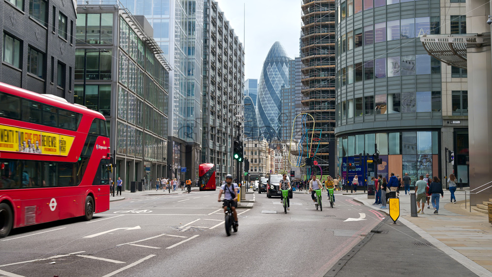 LONDON, UNITED KINGDOM – SEPTEMBER 12, 2023: Street scape of the City district with walking people, moving cars, modern buildings and skyscrapers around