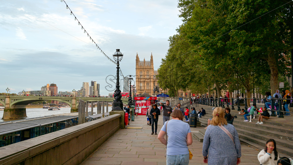 LONDON, UNITED KINGDOM – SEPTEMBER 13, 2023: Street scape of city downtown at sunset. Embankment street with walking people, Westminster Palace in the distance