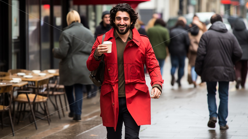 Londoner business man looks so happy while walking on the streets of london 9 am in the morning holding a coffee on his left hand