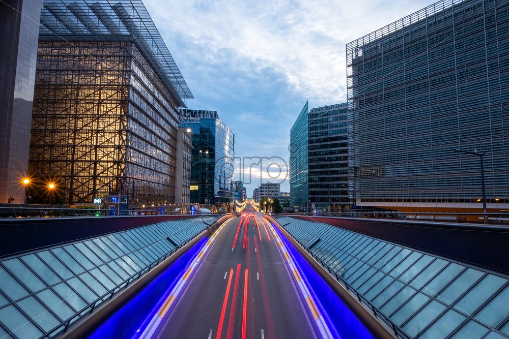 Home » Shop » buildings » Long exposure shot from a bridge in Brussels. Traffic tunel and Europen headquarters in the foreground