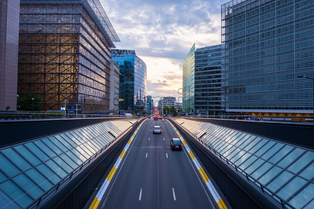 Long exposure shot from a bridge in Brussels. Traffic tunel and Europen headquarters in the foreground Royalty Free Stock photo