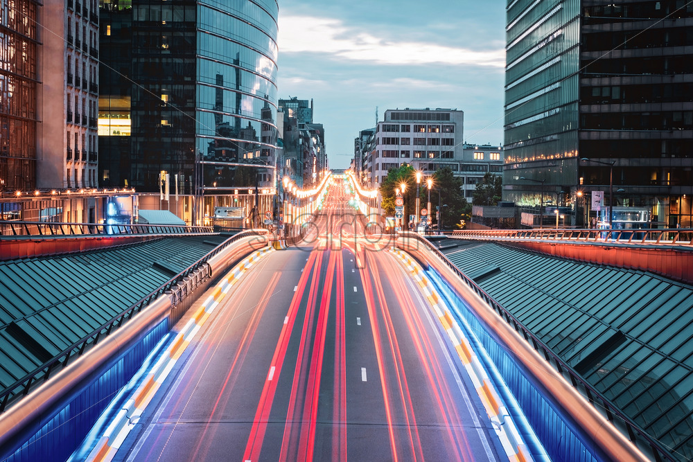 Long exposure shot from the bridge in Brussels, Belgium. Red traffic lights on the road Royalty Free Stock photo